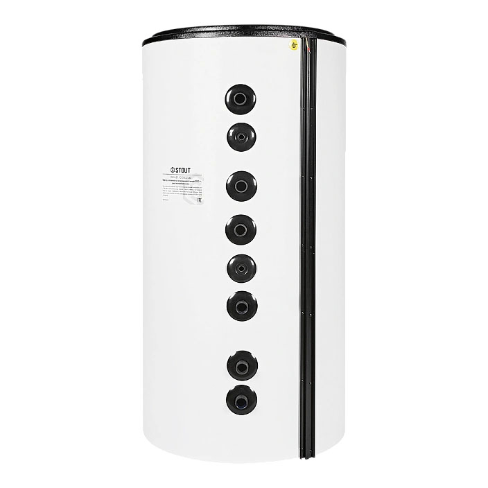 Бойлер STOUT SWH-2110 с двумя теплообменниками для ГВС. Эмалированный стальной бак нагревает и хранит воду, совместим с индивидуальным котлом, поддерживает рециркуляцию.