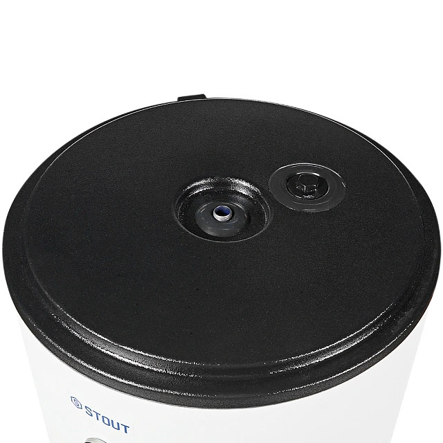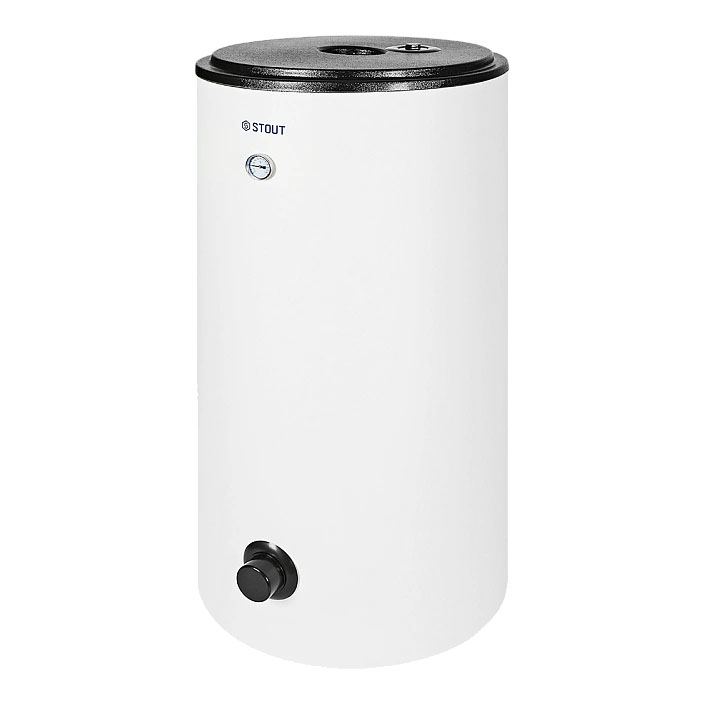 Бойлер STOUT SWH-2110 с одним теплообменником для ГВС. Эмалированный стальной бак нагревает и хранит воду, совместим с индивидуальным котлом, поддерживает рециркуляцию.