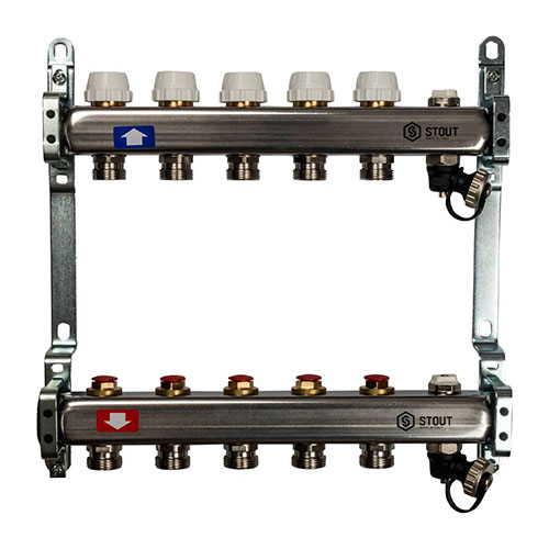 Коллектор из нержавеющей стали без расходомеров, с клапаном вып. воздуха и сливом 5 вых., Stout