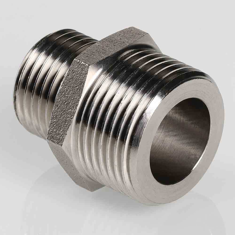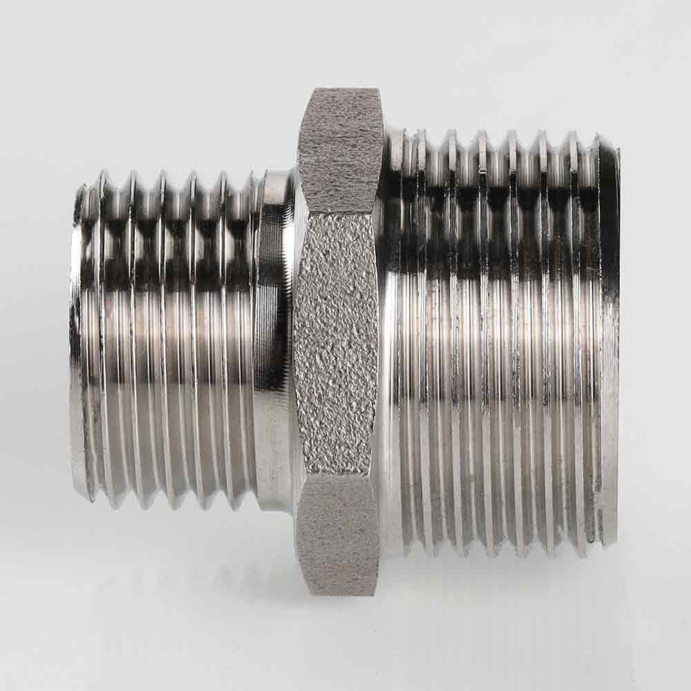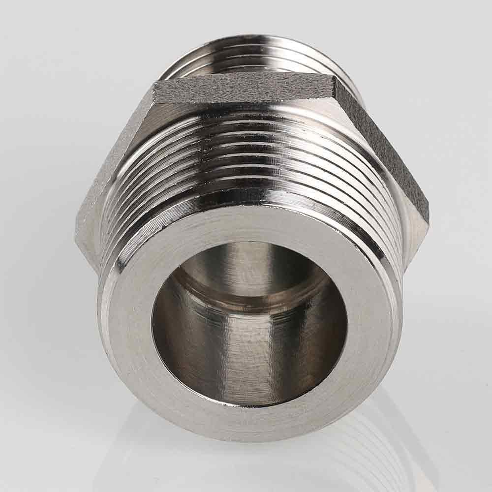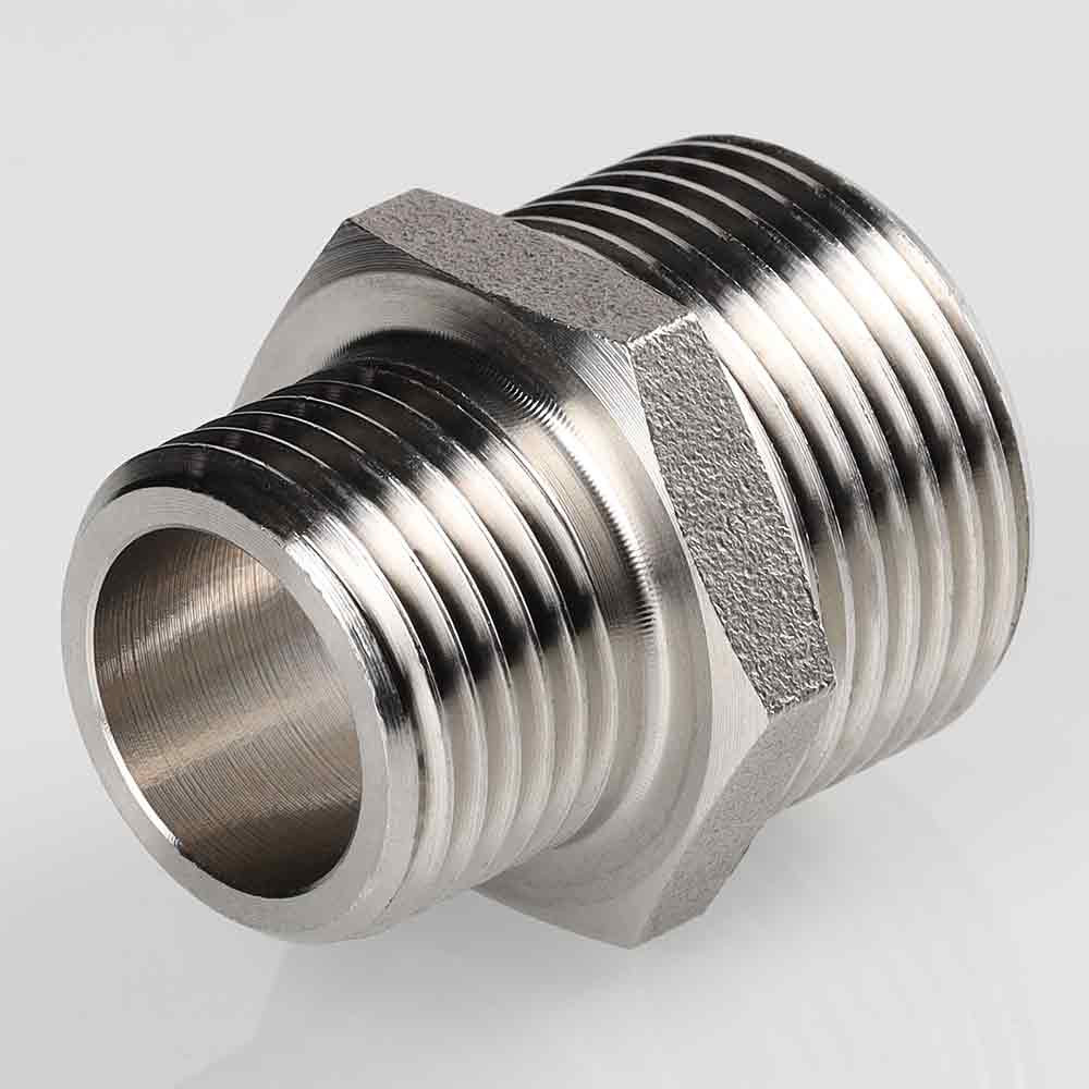 (VTi.580.I) Ниппель переходной из нержавеющей стали в составе системы VT.INOX-PRESS предназначен для соединения элементов с внутренней резьбой разных диаметров. Резьба патрубка меньшего диаметра имеет насечки – для эффективного удержания уплотняющего материала. Шестигранный – под гаечный ключ – участок корпуса облегчает монтаж соединения. Материалом фитинга служит сталь марки AISI 304, устойчивая к коррозии, химическому и термическому воздействию. В то же время область рекомендуемого применения фитингов VT.INOX-PRESS исключает трубопроводы жидких углеводородов и хлороводородных растворов.