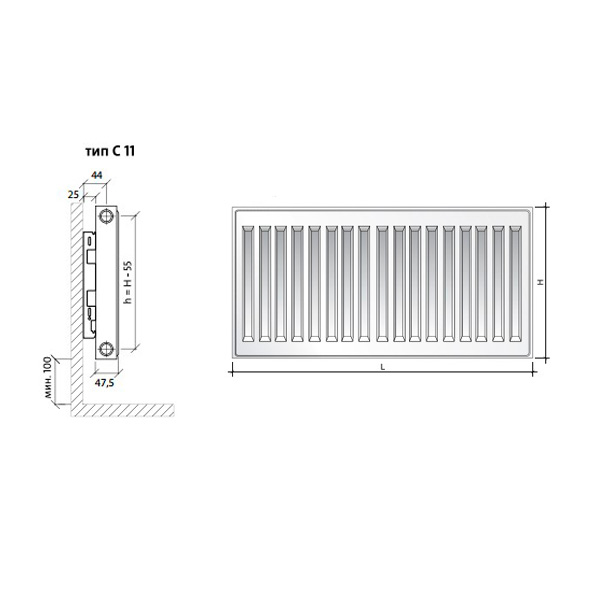 Стальной панельный радиатор с боковой подводкой COMPACT C11-500-1100 RAL9016, Royal Thermo