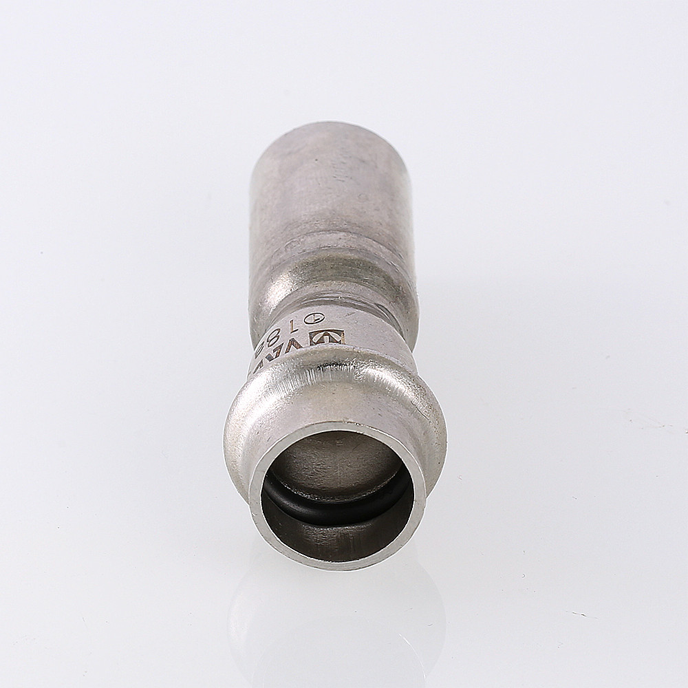 Фитинг VTi.905.l обеспечивает при монтаже переход трубопровода с одного диаметра на другой. Достоинством бесштуцерных соединителей является малый коэффициент местного сопротивления (сужение канала практически отсутствует). Фитинг рассчитан на обжатие с помощью пресс-инструмента V-профиля.