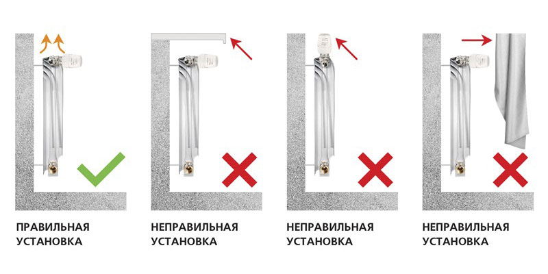 Важно: Термоголовка должна быть установлена горизонтально (перпендикулярно радиатору), чтобы избежать нагрева от корпуса радиатора, что может привести к некорректной работе.