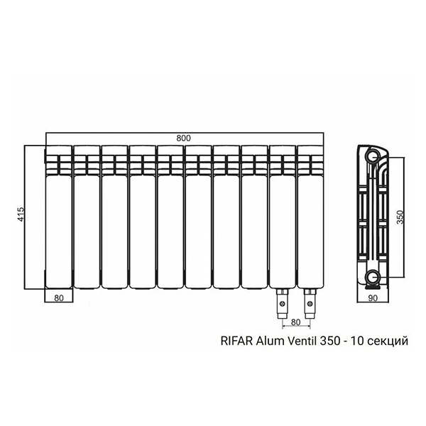 Алюминиевый секционный радиатор Alum Ventil 350/08 (8 секций), нижнее правое, Rifar