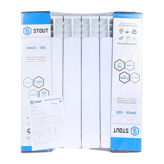 Радиатор биметаллический Space 500 4 секции нижнее правое подключение RAL9016, Stout