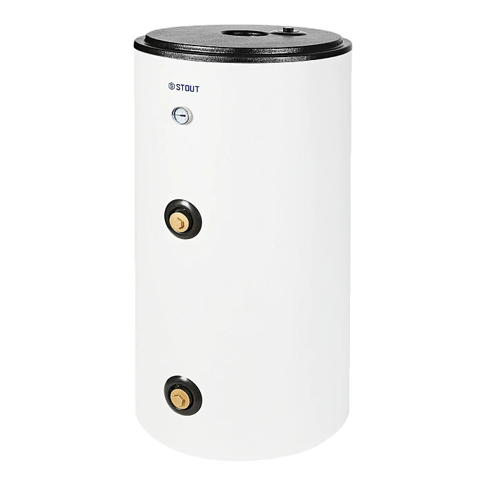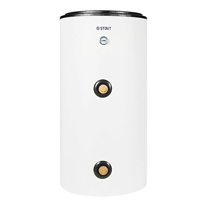 Бойлер STOUT SWH-2110 с двумя теплообменниками для ГВС. Эмалированный стальной бак нагревает и хранит воду, совместим с индивидуальным котлом, поддерживает рециркуляцию.