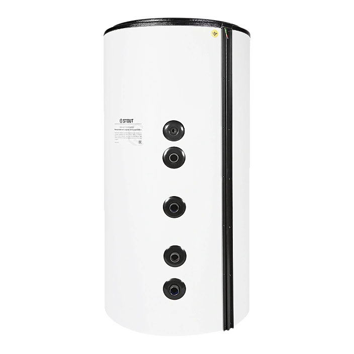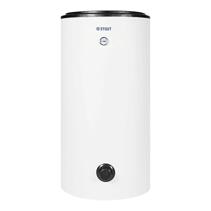 Бойлер STOUT SWH-2110 с одним теплообменником для ГВС. Эмалированный стальной бак нагревает и хранит воду, совместим с индивидуальным котлом, поддерживает рециркуляцию.