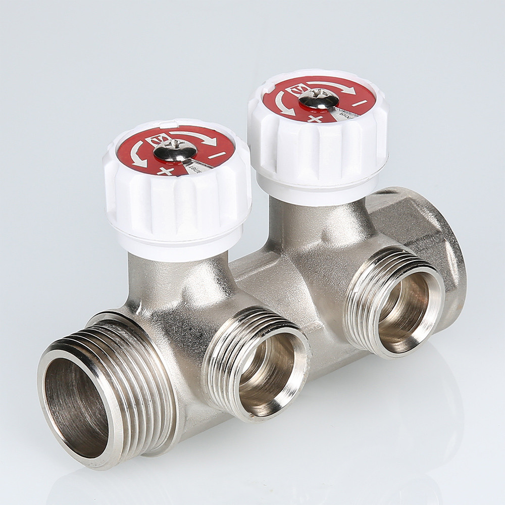 Коллектор с регулирующими вентилями, 1"х2 вых. Евроконус 3/4", на подающий трубопровод, ВР-НР, Valtec