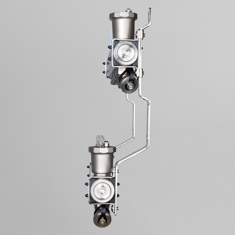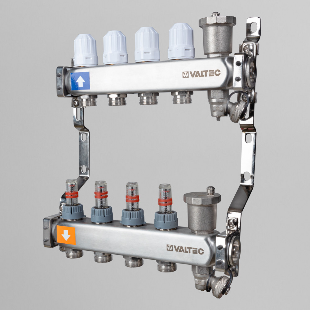 Выходы обратного коллектора блока VTс.579 оборудованы регулирующими клапанами с возможностью установки электротермических сервоприводов, подающего – настроечными клапанами с расходомерами (ротаметрами). Коллекторы оснащены автоматическими воздухоотводчиками и дренажными кранами. В комплект входит пара сдвоенных кронштейнов с двумя комплектами хомутов.