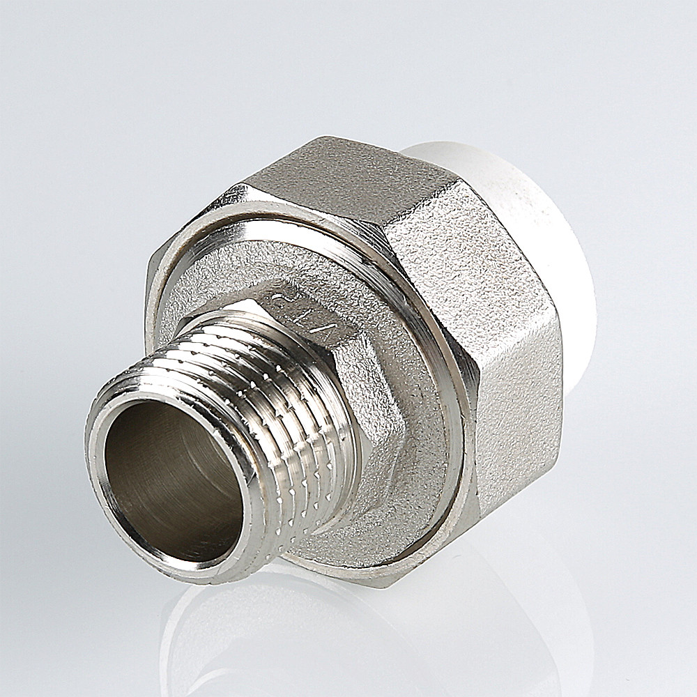 (VTp.761.0) Полипропиленовый фитинг для создания разъемного, с использованием накидной гайки, соединения полипропиленового трубопровода с трубопроводом или арматурой из других материалов. Уплотнительное кольцо выполнено из синтетического каучука EPDM. Резьба фитинга – наружная трубная по ГОСТу 6357.