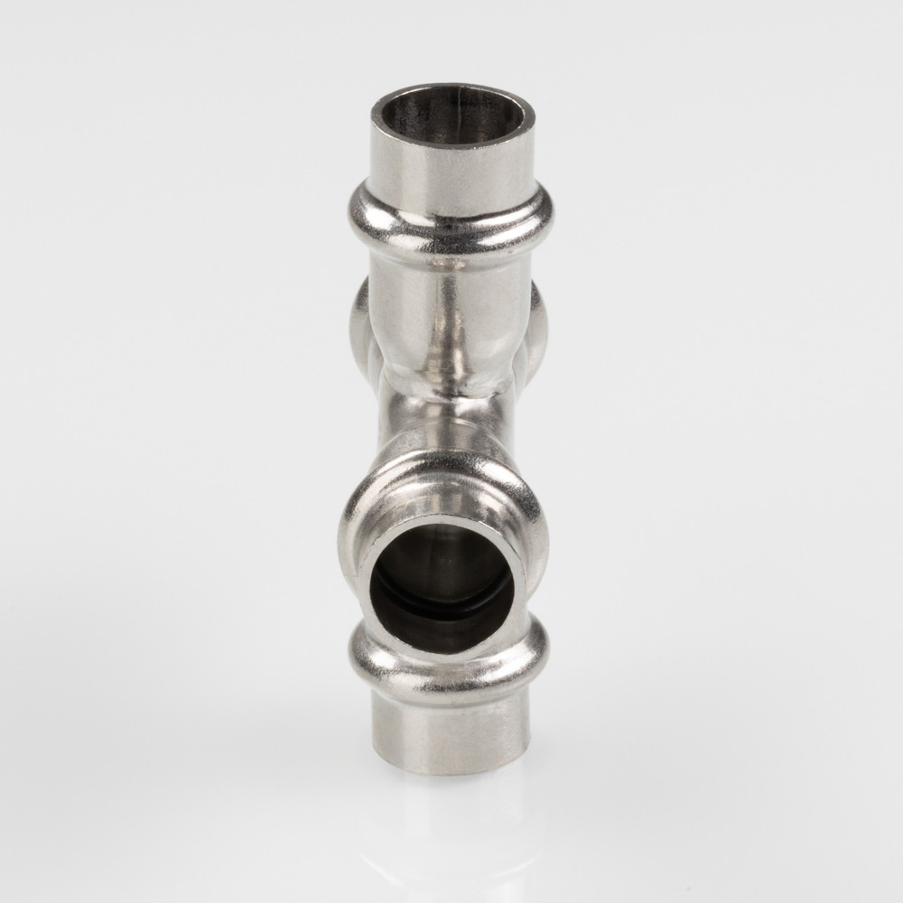 Благодаря бесштуцерной конструкции соединитель обладает малым коэффициентом местного сопротивления – сужение канала практически отсутствует. Фитинг рассчитан на обжатие с помощью пресс-инструмента V-профиля.