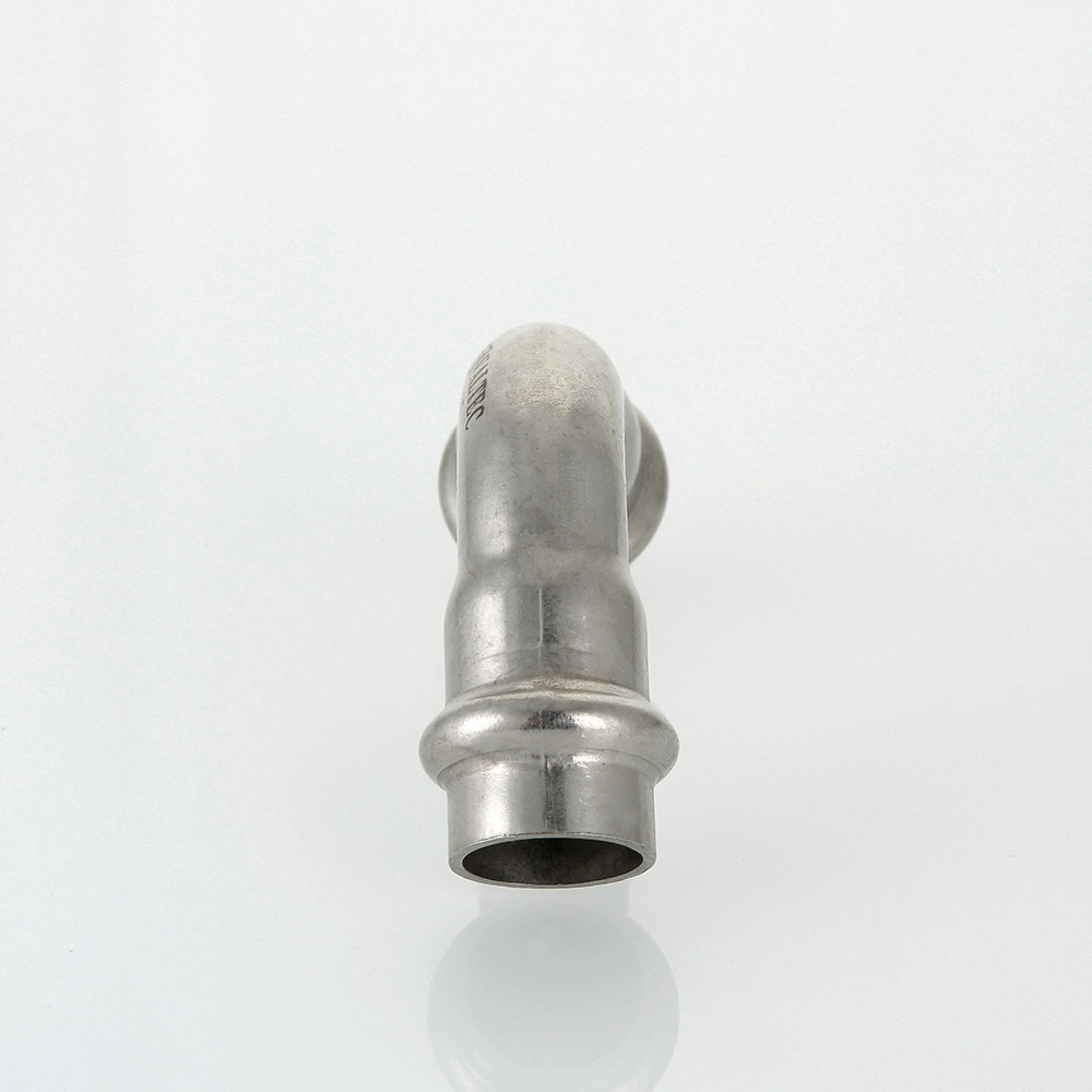 (VTi.951.I) Двухраструбный пресс-угольник из нержавеющей стали обеспечивает соединение под углом 90° тонкостенных стальных труб систем водоснабжения, отопления, иных инженерных и технологических установок с рабочей температурой до 120 °С и давлением до 16 бар. Изделие изготовлено из стали AISI 304. Материал уплотнительных колец – эластомер EPDM. Отдельно можно приобрести уплотнительные кольца из FPM (витон); в этом случае максимальная рабочая температура увеличивается до 140 °С.