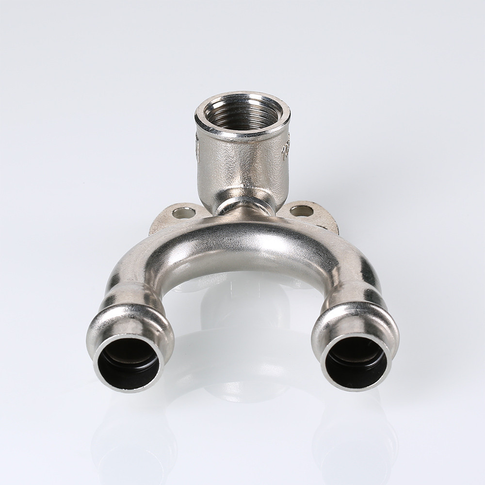 (VTi.954.DI) Проходная водорозетка в системе INOX-PRESS представляет собой U-образный тройник с угловым переходом на внутреннюю резьбу в центральном отводе и креплением.