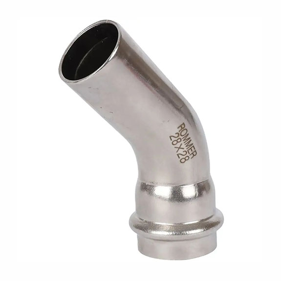 Угольник однораструбный 45° ВПр-НПр 28х28мм, из нержавеющей стали, пресс, Rommer