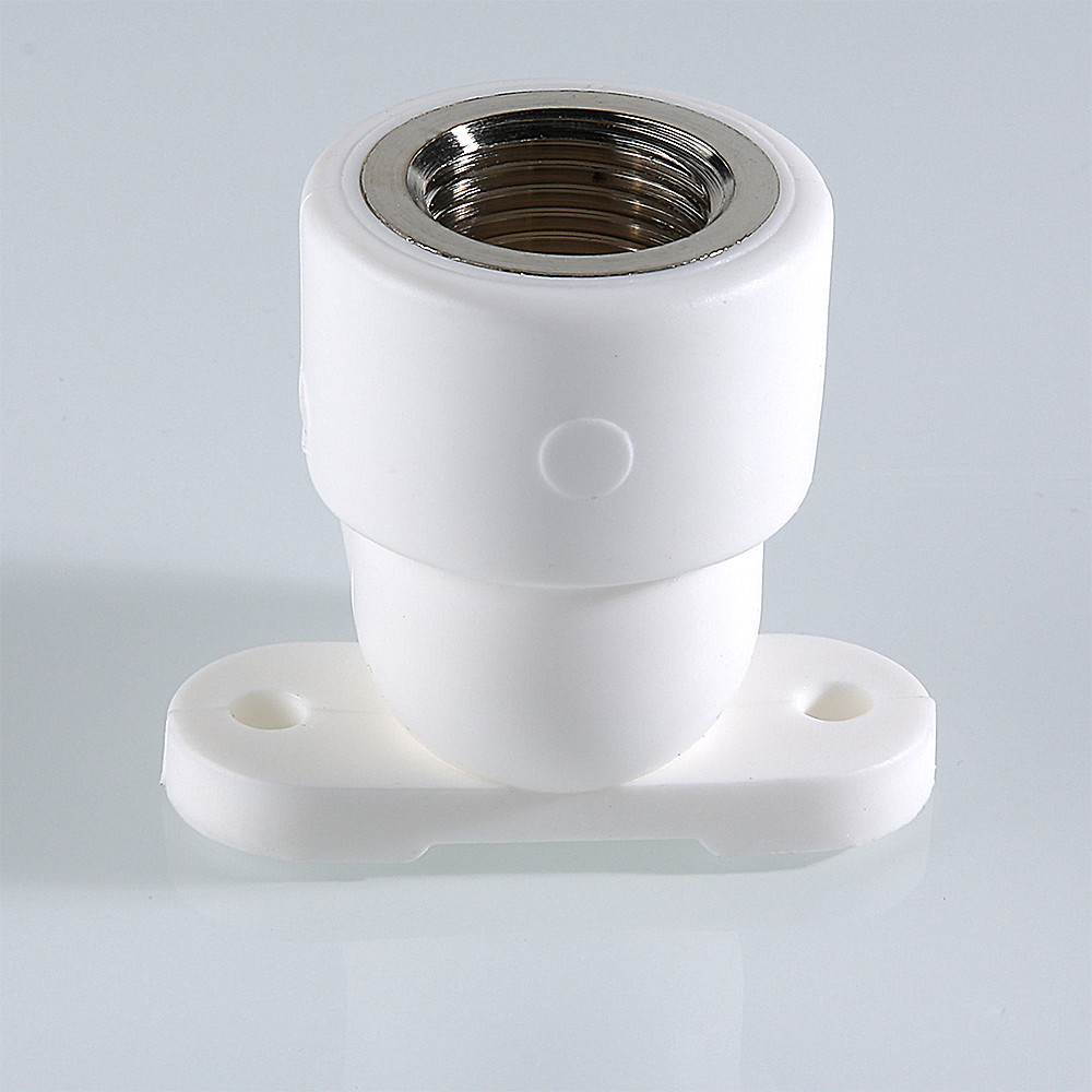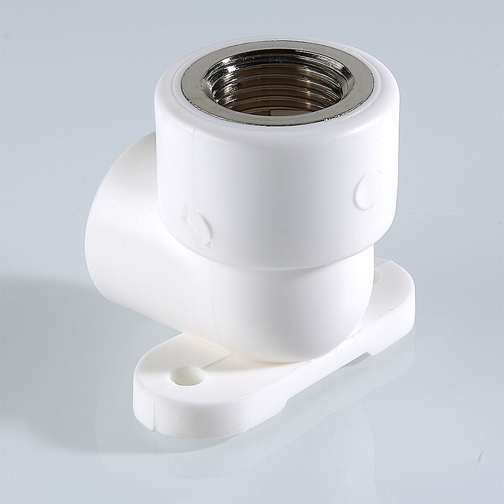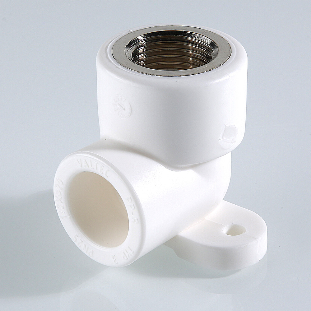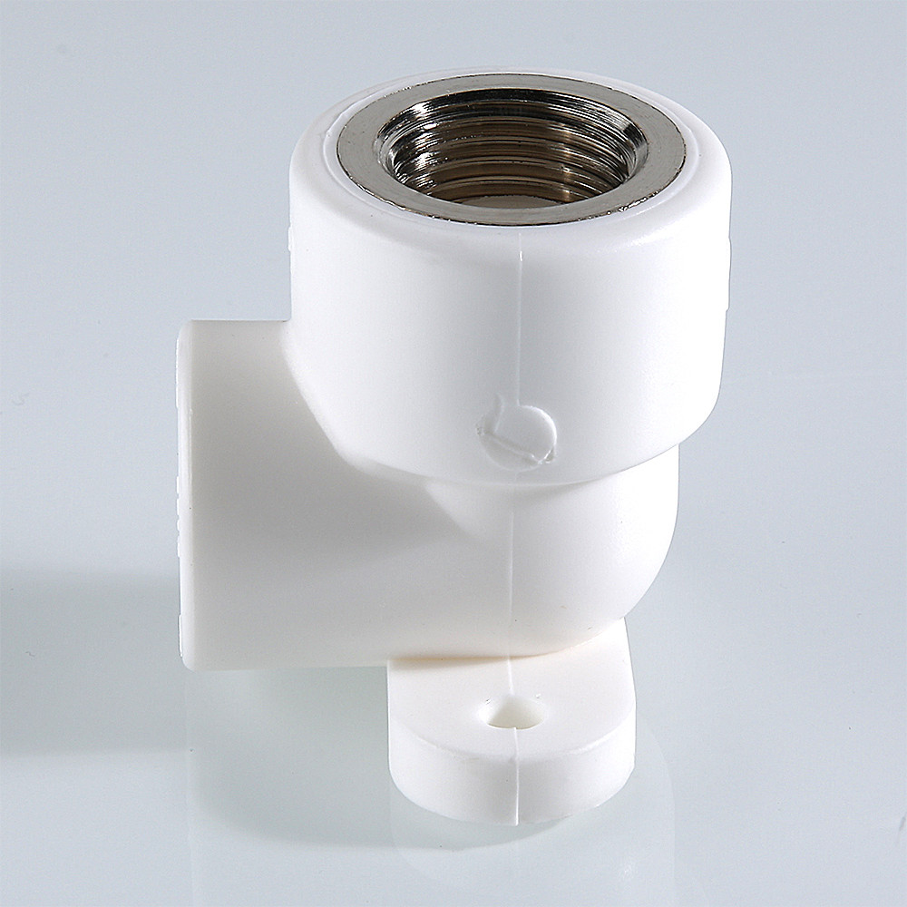 (VTp.754.0) Комбинированный угловой фитинг с креплением (полипропиленовая водорозетка), предназначенный для подсоединения к полипропиленовому трубопроводу сантехнического смесителя или другого компонента инженерной системы с резьбовым подключением. Резьба фитинга – внутренняя трубная по ГОСТу 6357.